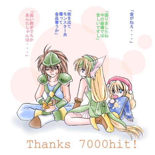 7000HITキリリク「お金が無くて悩む」デュランとリースとおまけのシャル(笑)。 「店で」という設定が表現できませんでしたが・・・(苦笑)。 とりあえずどこかの店の中での会話だと思って下さればと。 このイラスト描き上げて気付きました。 シャルロットが漢字を喋っていることに・・・・・・。わお。 03.12.20 up