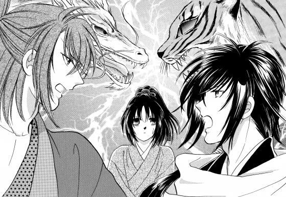 睨み合う二人の背後に幻の嵐が巻き起こり、龍虎の幻影が咆哮する。