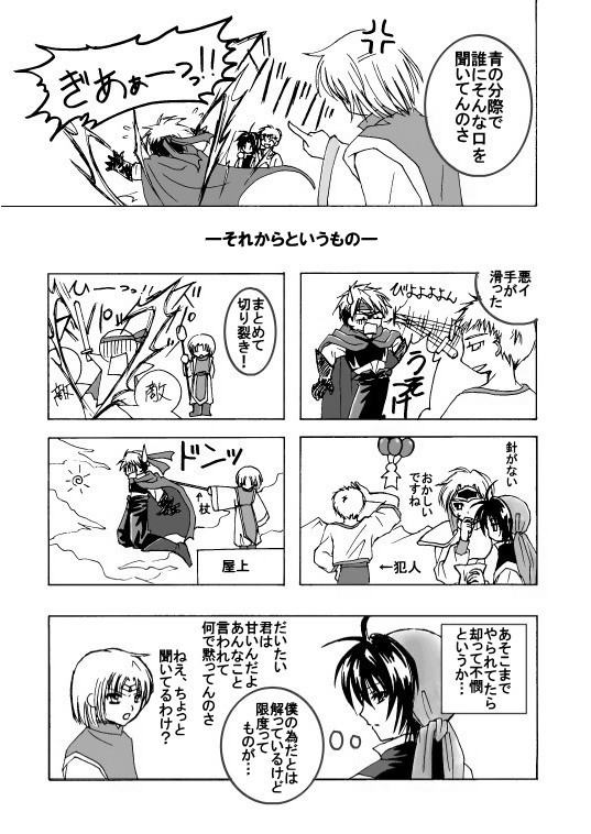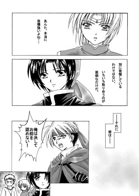 仲良し3人の心温まる友情物語と言えば聞こえはいいけど、 実際は解放軍名物、ルックとシーナのフリック苛めです(笑)。 坊ちゃんがフリックの罵倒を黙って耐えていた理由はこの辺が真相かも知れない(苦笑)。