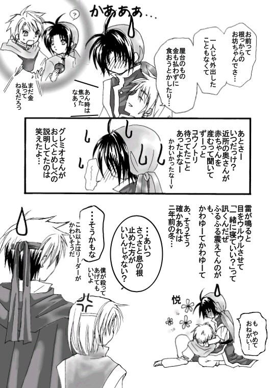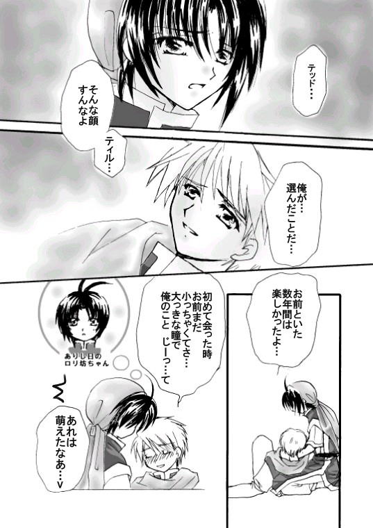 坊ちゃんの腕の中で眠りにつくテッドの話。 つまり坊ちゃんの腕の中で延々と話してるテッド・・・ あ、石を投げないでっ。だから心の広い方のみって書いたんですっ(汗) 友人に「テッドの走馬灯はいつまで続くんだろうね」と言うと、 「坊ちゃんの目を盗んでルックが殺るまでずっと」という返答が返りました(笑)。 ・・・そうか、テッドを殺ったのはルック・・・。 あ、私も友人も、まごうことなくテッド好きです。