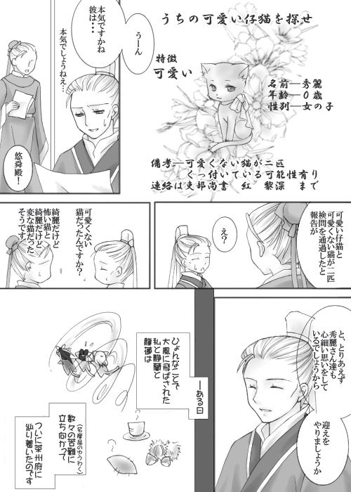 燕青と悠舜さん登場です。 猫が王様になれる彩雲国、州牧やってても不思議ではございません(え?)。 今回、本当に難産でしたー(涙)。悠舜さん難しい・・・。 この日の秀麗の日記→